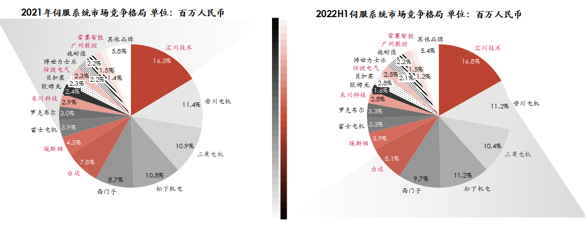 從2021年開始匯川技術一躍成為中國伺服系統市場第一品牌,2022年H1市場地位一直維繫,且不斷擴大差距;與此同時,埃斯頓、禾川科技、信捷電氣、廣州數控、雷賽智能在伺服市場的業績每年也在保持高速增長。