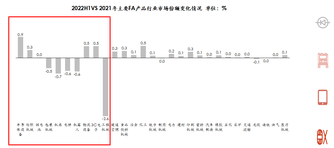 2021年,Top10行業主要FA產品市場佔有率達60%;但在2022年上半年,市場集中度略有下降,其中:鋰電池、包裝機械、機牀、機器人、工程機械行業景氣度下行;不過,新能源汽車市場熱度不減,預計下半年鋰電池、機器人市場將持續回温。