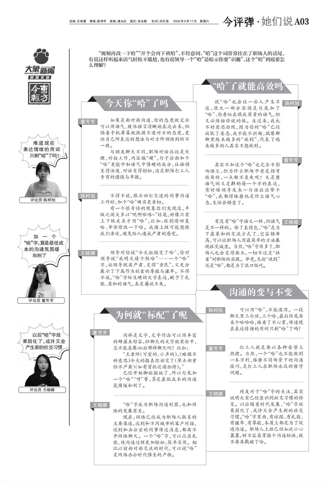 王曉娜:網友對於“哈”字的關注,其實説明大家已經意識到社交習慣的轉變。以後隨着時代發展,“哈”字效果弱化了,或許又會產生新的社交習慣。“哈”字裏面,有試探、有禮貌、有謙卑、有尊敬,本質上都是為了促進溝通。職場人上班已經如此小心翼翼,好不容易掌握個溝通秘訣,就不要再戳破了哈。