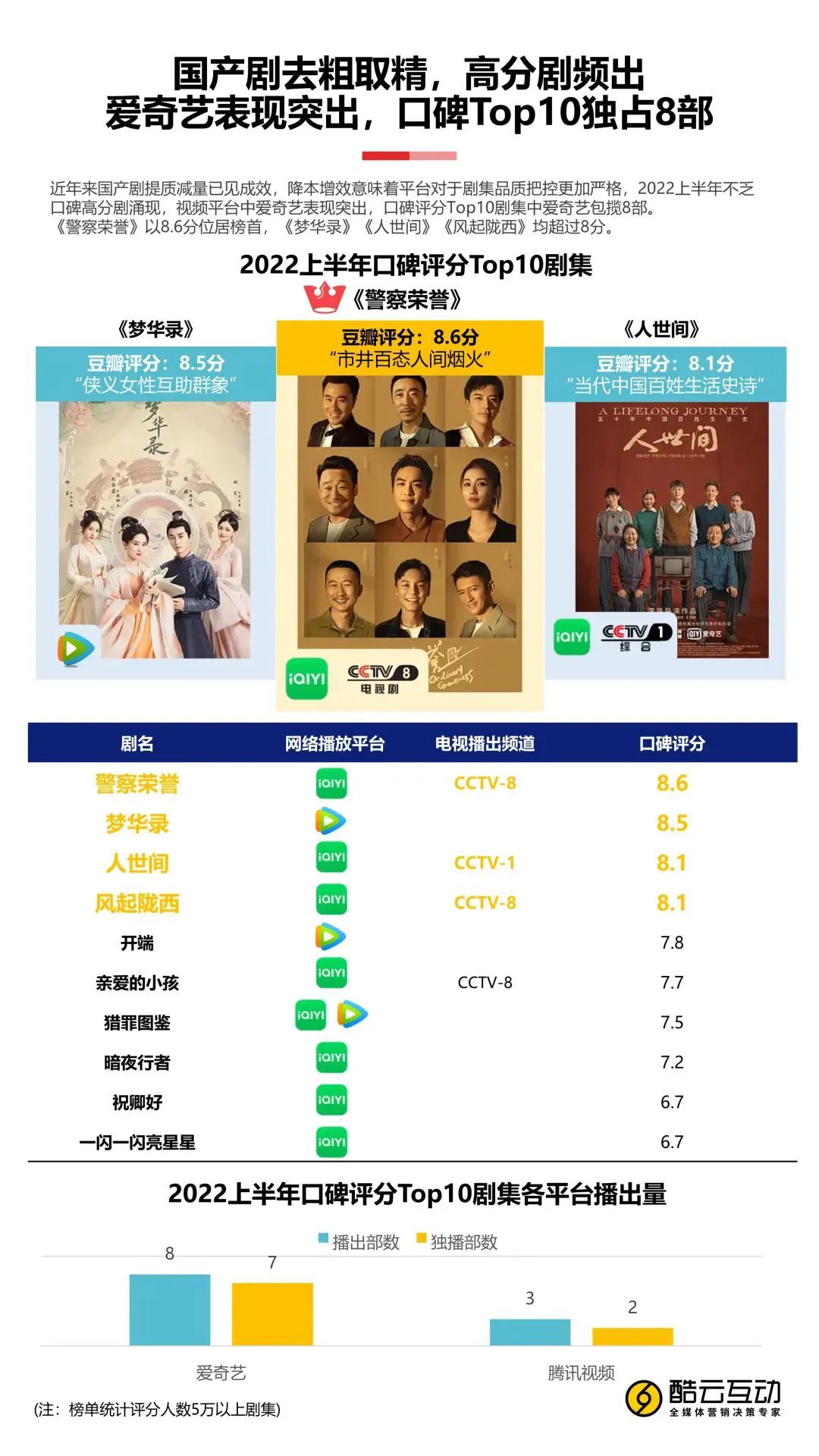 在2021年,愛奇藝便宣佈將把“體現時代情緒的主流國民大劇”作為未來佈局重點,以“正劇領跑、故事領跑、話題領跑、演技領跑”引領劇集創作。今年,這些策略已明顯開花結果。酷雲發佈的《2022上半年劇集市場分析報告》顯示,上半年國產劇的口碑評分TOP10中,愛奇藝佔據了8部。
