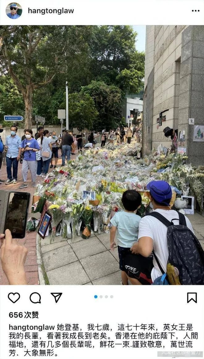 配文是“她登基,我七歲,這七十年來,英女王是我的長輩,看着我成長到老矣。香港在她的庇廕下,人間福地,還有多少個長輩呢?鮮花一束,謹致敬意,萬世流芳,大象無形。”