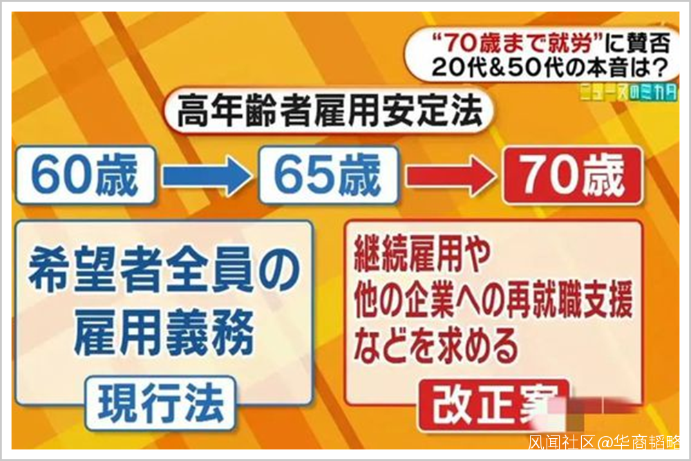 2021年4月,日本政府開始實施修改後的《高齡者僱用安定法》,規定企業有義務確保員工到70歲的就業機會。