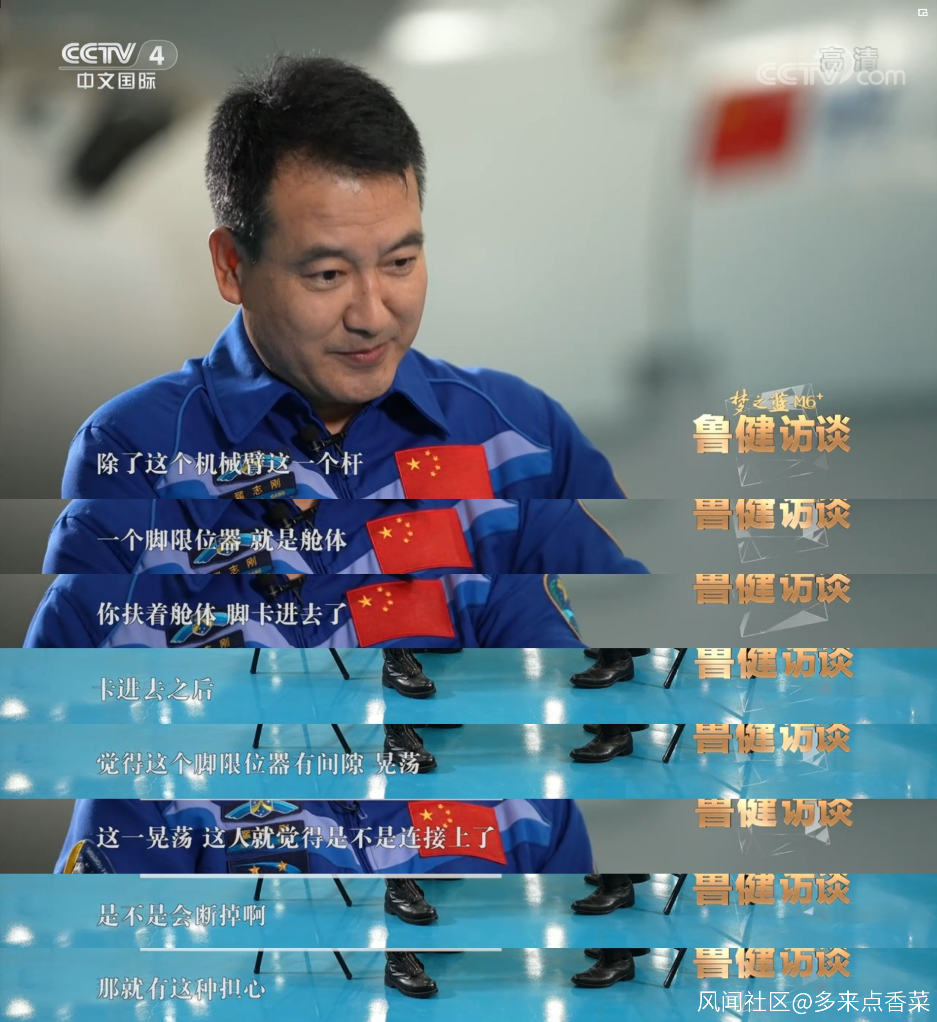 “再一個之後你上了機械臂,你這個視野就隨着機械臂來動了,它還給你轉到外太空,整個艙體你就看不見了,整個看見的就是不叫漆黑一片,叫深不見底一片,太深了,沒有邊際,有一種自己無法征服,或者是恐懼的這種感覺。深淵,就是那種感覺,在天上出艙的時候還是很強烈的。”
