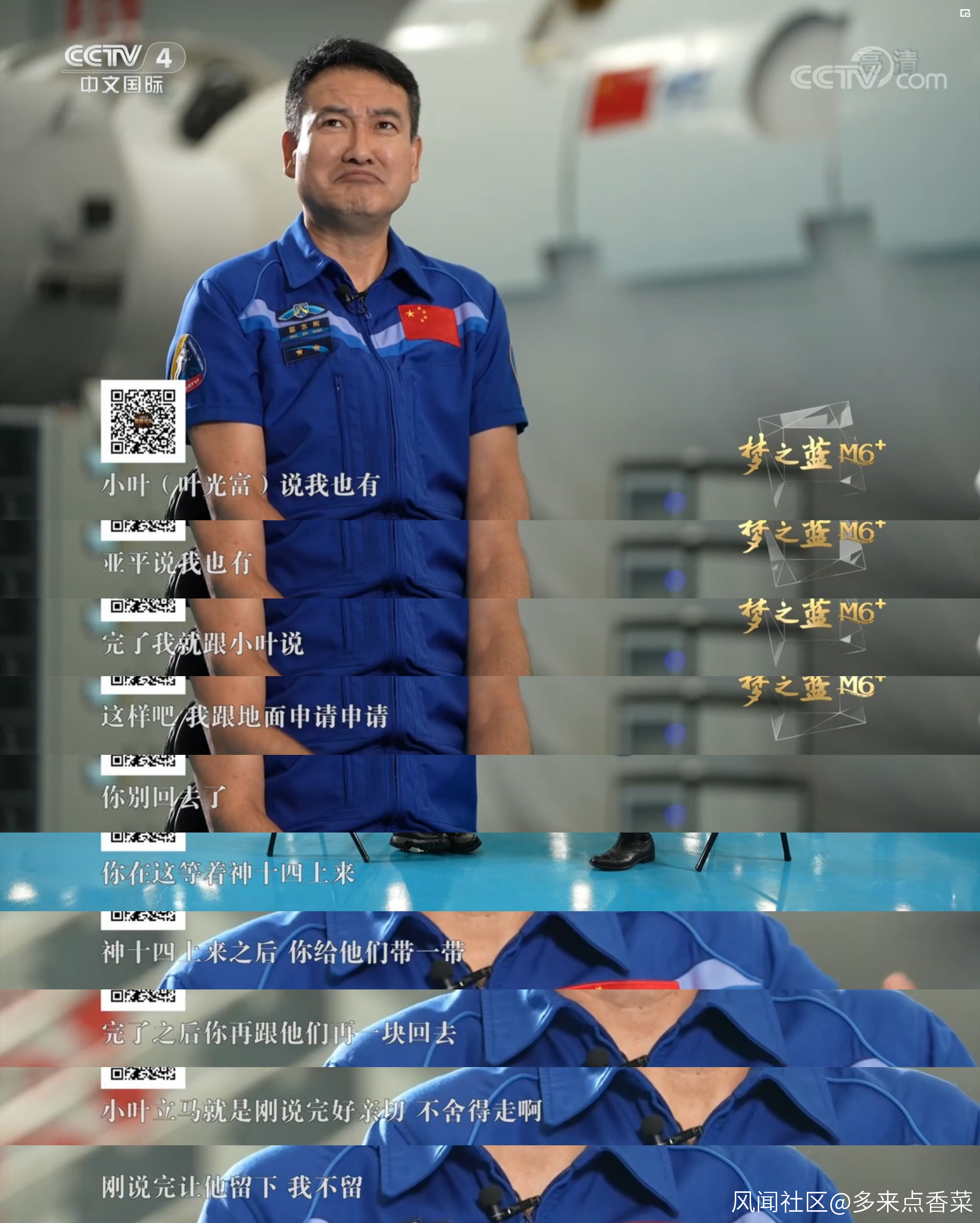 神十三乘組的另外兩名航天員王亞平和葉光富也有這種感覺。説到這,翟志剛講起了撤離空間站前的一個小故事,他跟葉光富説,要不跟地面申請申請,你別回去了,等神十四他們上來了你帶一帶他們,然後跟他們一起回去。