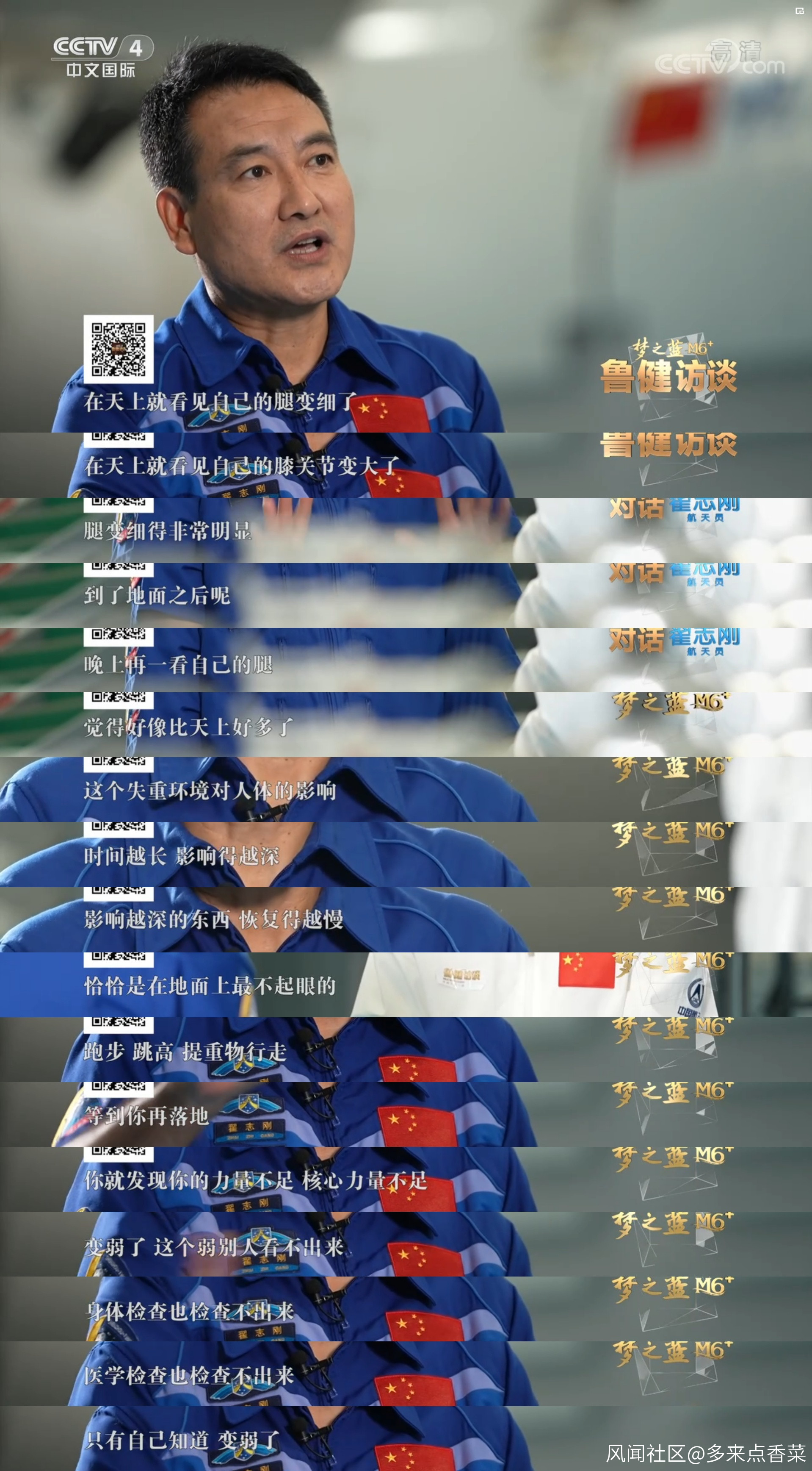 翟志剛説,在太空就能看見自己腿變細了,膝關節變大了。在太空時間越長,對人的影響就越深,而影響越深的東西,恢復得越慢。落地後會發現自己的核心力量不足,變弱了,而且這種變弱是醫學檢查檢查不出來的,只有自己知道。