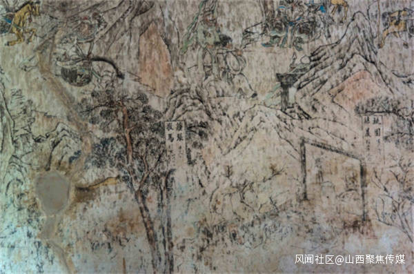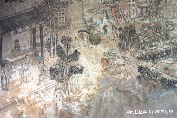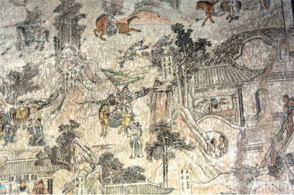 殿內三壁繪有關公生平的壁畫,由水墨繪成,人物精細生動,線條自然流暢,是難得的珍貴遺蹟。畫中的故事大多取材於羅貫中的小説《三國演義》,如“温酒斬華雄”、“過五關斬六將”、“單刀赴會”等。關公一生義薄雲天、忠義仁愛,在百姓眼中,關公的神勇善戰可護一方平安,因此在關帝像前祭拜時,便多了一份虔誠、一份敬仰。