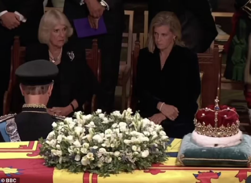 在愛丁堡荷里路德宮迎接女王靈柩的索菲(中)、
