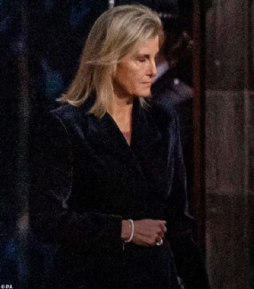 參加完女王守夜儀式後,索菲王妃被拍到面色凝重地走出聖吉爾斯教堂