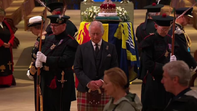 在當日晚舉行的守夜活動中,剛剛繼位的國王查爾斯三世,率領一眾弟弟妹妹為母親守靈。他和安妮公主、安德魯王子以及愛德華王子分別站在靈柩的四角,低頭默哀,時間持續了十分鐘。