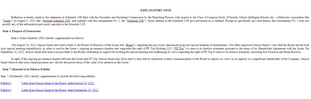 上述公告表明,時穎公司已向FF董事會連續發出兩封信函,督促儘快召開特別股東大會和年度股東大會,並重申FF Top作為FF大股東,完全擁有根據股東協議罷免包括獨立董事Brian Krolicki和董事長Susan Swenson的相關權利。