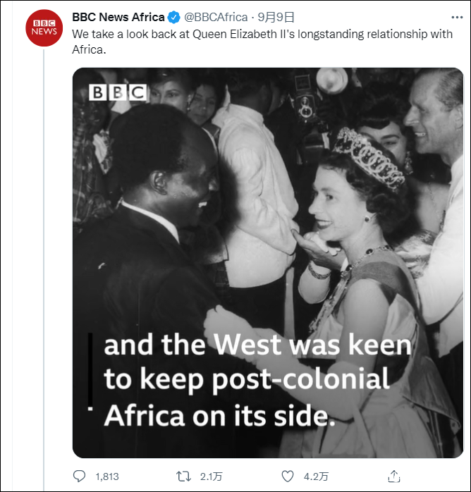 “她在肯尼亞訪問時(1952年)繼位為女王,而非洲人在自己的土地上被種族隔離、奴役、折磨和殺害。這就是BBC所認為的長期關係。”