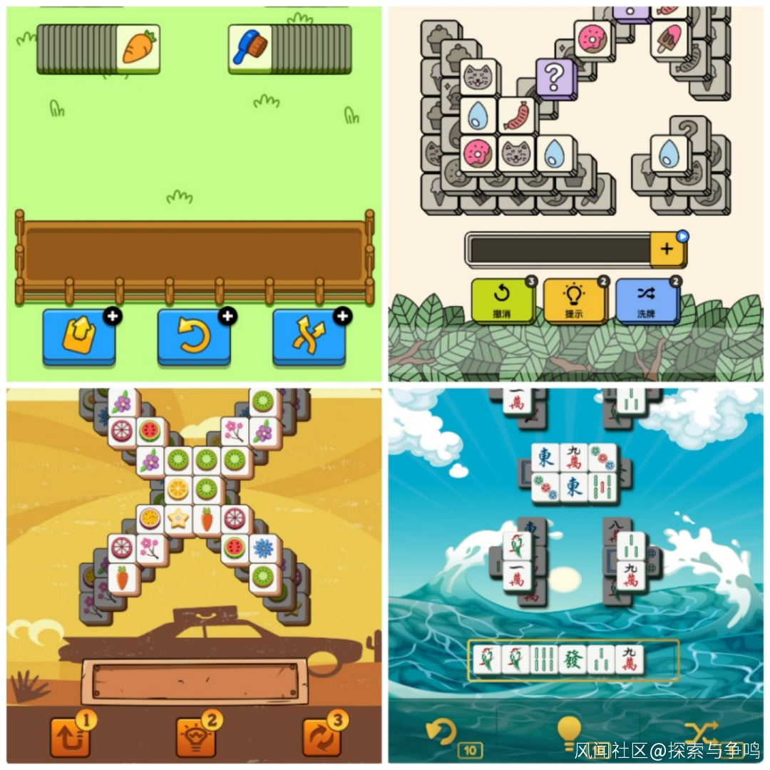 左上《羊了個羊》右上《3lites》左下《方塊大師》右下《麻將迷陣》