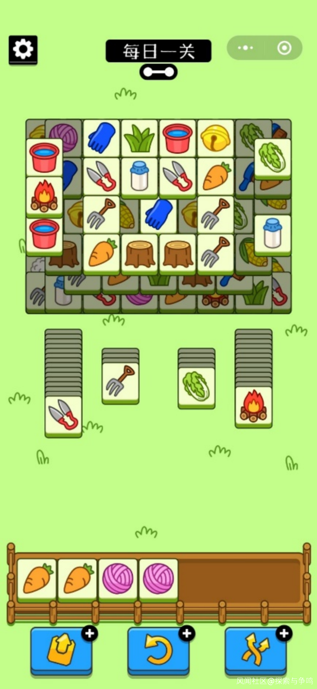《羊了個羊》顯然具備上述超休閒遊戲的全部特點,那麼它就僅僅是另外一個《合成大西瓜》,一個超休閒遊戲偶然的爆破點麼?我們先來分析一下《羊了個羊》遊戲本身再下結論。《羊了個羊》的核心玩法是傳統的三消遊戲(match-three games)玩法,即三個相同的卡片擺在一起就會消除。遊戲畫面上堆疊着不同種類的卡片,下方有一條可以放置七張卡片的卡槽,玩家將卡片拖入到卡槽之中,三張一樣的卡片挨在一起就會消除。消掉畫面上堆疊的全部卡片就可以通關,卡槽堆滿則算失敗。遊戲分為兩個關卡,第一關只有3種卡片,隨便亂點也能通關,而第二關則飆升至13-16種(遊戲每次更新、修復後種類數量會產生變化),難度極高。遊戲在宣傳過程中打出了“通關率不到0.1%”的標語,同時,遊戲中可以通過觀看廣告來獲得三種輔助遊戲進程的道具。