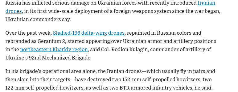 他説,僅在他的旅的作戰區域內,伊朗無人機---它們通常成對飛行,然後猛擊目標---就摧毀了兩門152毫米自行榴彈炮、兩門122毫米自行榴彈炮以及兩輛BTR裝甲步兵車。