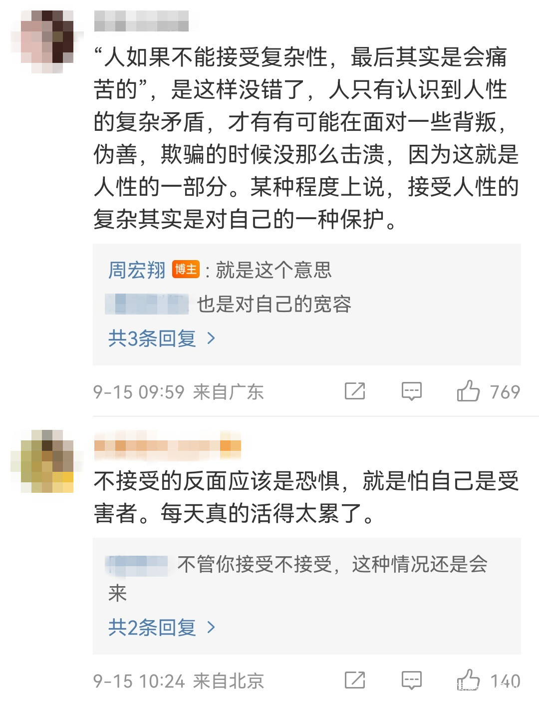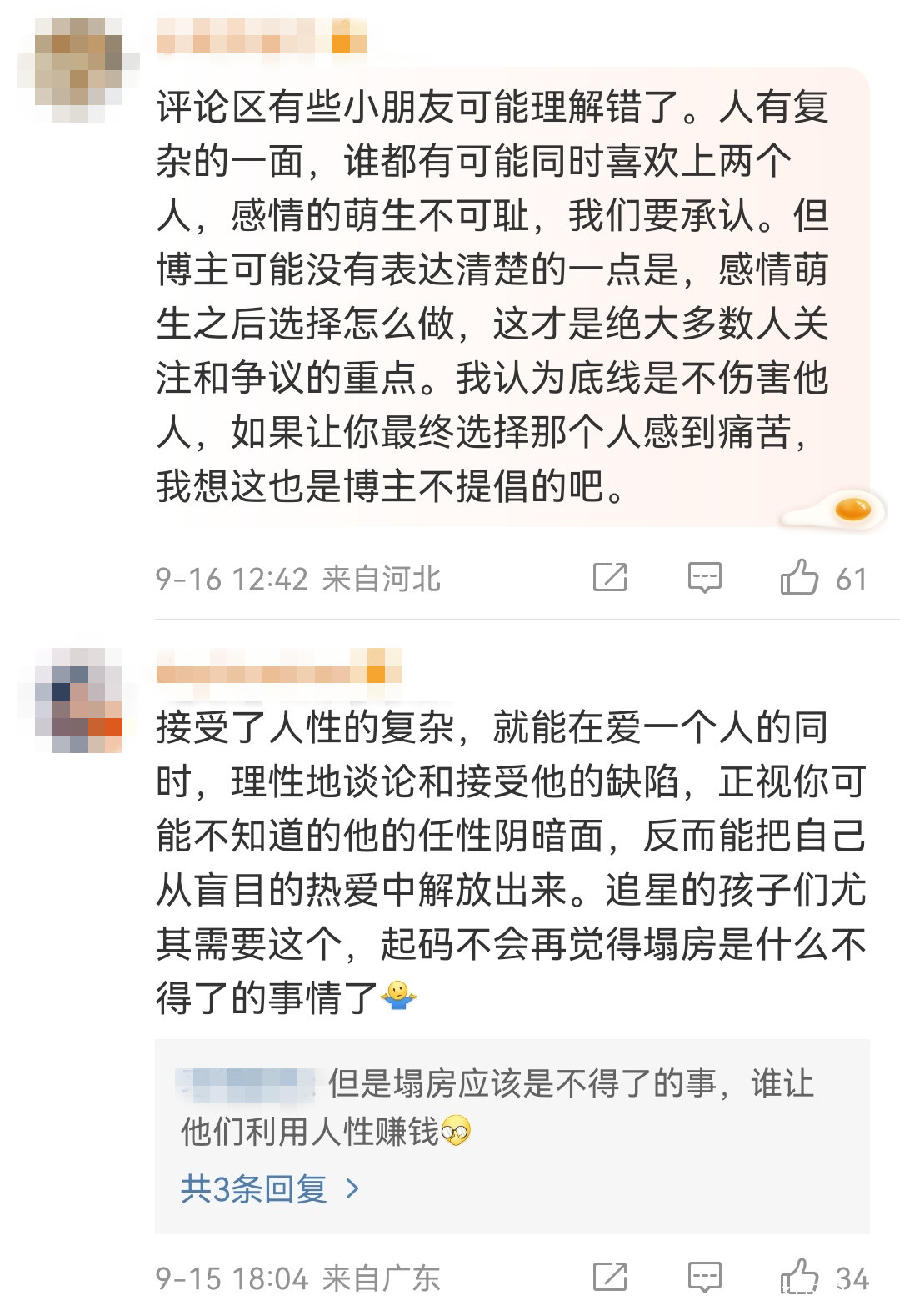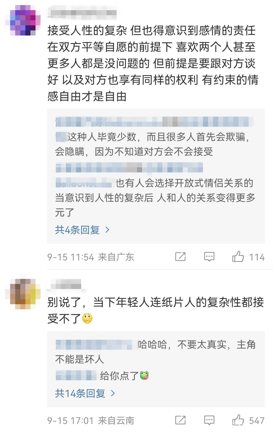 我就舉一個例子,我説我前段時間發了一條微博,朋友和前任已經變成了無話不談的朋友,但又在新戀情到來的時候,會猶豫不想和前任斷絕聯繫。這條微博有很多人會罵,覺得應該把之前的感情處理清楚了,再去談戀愛。再舉一個例子,我有一個朋友同時喜歡兩個人,很渣嗎?是的,但是他又是真心喜歡,真心在付出,而且不計回報。