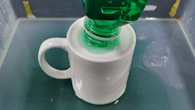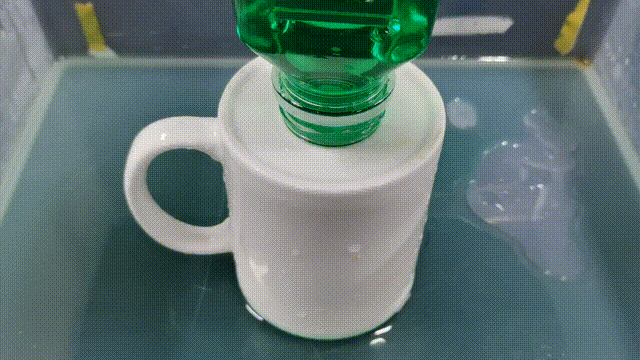 如果我們選擇將瓶子傾斜,瓶內的壓強並不足以克服有流動性的水從巨大的缺口中流出,所以瓶口會漏出一部分液體。而由於水的張力、與瓶口的吸附力等一系列因素會使流出的液體形成一個弧形的液麪包裹住傾斜的缺口,水就難以繼續流出了。而由於瓶內壓強逐漸下降,流出的水會被逐漸吸回去,並在帶入一定的氣泡使瓶內外壓強平衡時進入下一個循環。