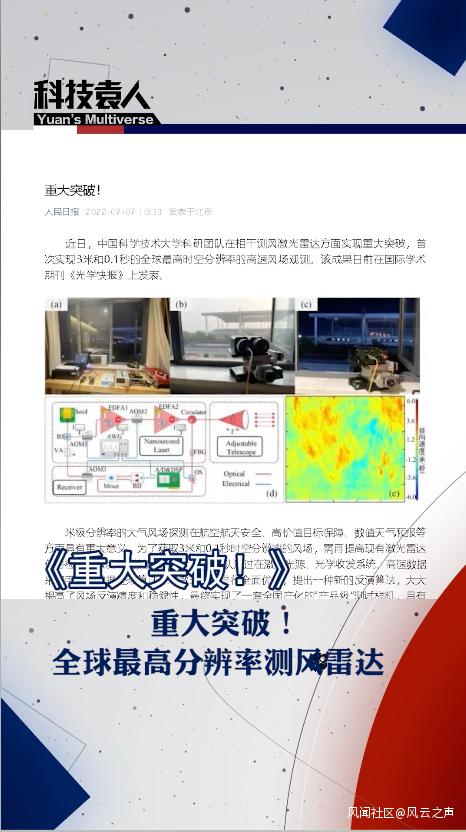 最近,人民日報微信報道了一個重大突破,——這文章的標題就叫《重大突破!》。中國科學技術大學團隊在相干測風激光雷達方面實現重大突破,首次實現3米和0.1秒的全球最高時空分辨率的高速風場觀測,發表在《光學快報》(https://opg.optica.org/ol/fulltext.cfm?uri=ol-47-13-3179&id=477123)。