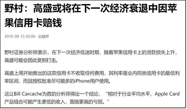 蘋果信用卡當時剛推出時,就有一些大機構認為,高盛可能會在下一次經濟衰退中,會因為蘋果信用卡賠錢。