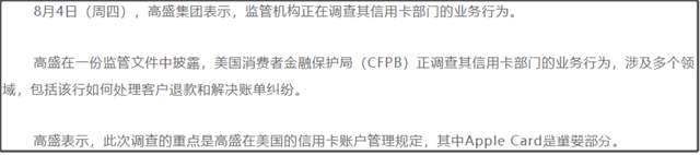 早在今年8月4日,高盛集團就表示,監管機構正在調查其信用卡部門的業務行為。