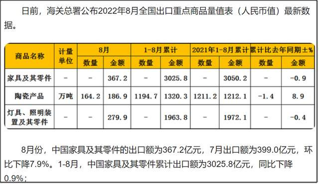 比如説,海關總署發佈的8月出口分類數據裏,其中8月傢俱出口額是環比下降了7.9%。