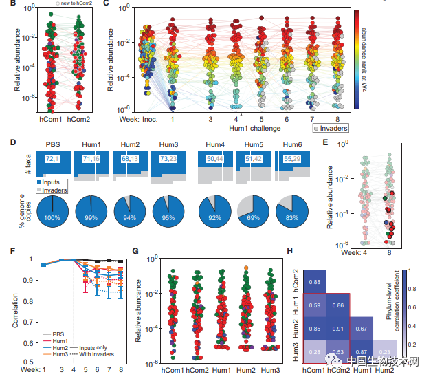 結果顯示,在被糞便樣本挑戰的小鼠中,第8周平均89%的基因組副本來自hCom1,其餘11%代表了從糞便樣本中加入到hCom1的新菌種。儘管有新菌種加入,hCom1的菌羣結構仍然保持不變。因此,hCom1對人類糞便的挑戰具有廣泛但不完全的彈性。
