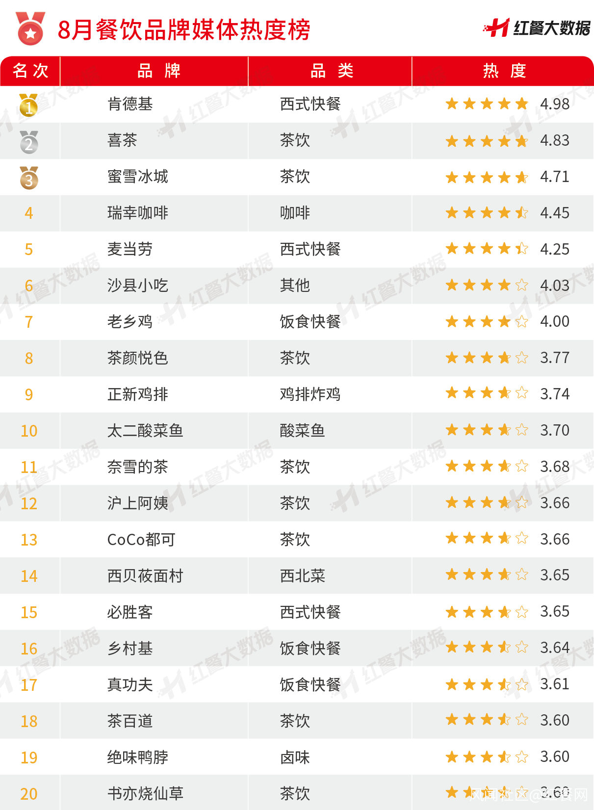 餐飲品牌媒體熱度榜,主要通過分析品牌在微信、微博、各大新聞網站等媒體平台上的搜索以及曝光情況來做排名。8月,媒體熱度榜前三品牌分別是肯德基、喜茶以及蜜雪冰城,跟隨其後的還有瑞幸咖啡、麥當勞等品牌。