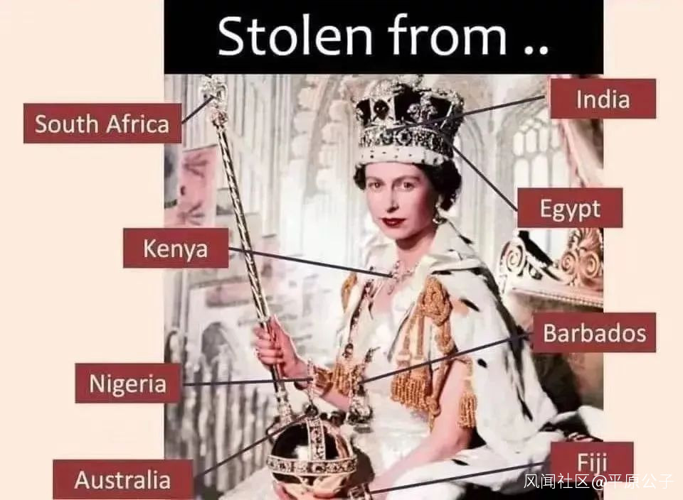 伊麗莎白二世身上的行頭,不都是世界人民的民脂民膏嗎?不都是用殖民軍隊的燒殺搶掠來的贓物嗎?