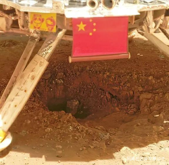 4、從登月照片可以看出,中國月球探測器的支架,是陷入土壤的;而美國的載人登月探測器,重量更大,四隻腳卻淺淺立在月面上,毫無衝擊的痕跡……有人説那是因為阿波羅登陸的時候發動機反衝緩降,所以沒有壓痕,那麼發動機反衝的痕跡呢?中國的祝融登陸火時吹出了那麼大一個坑,阿波羅質量更大,發動機推力更強,為什麼下面平滑如鏡?