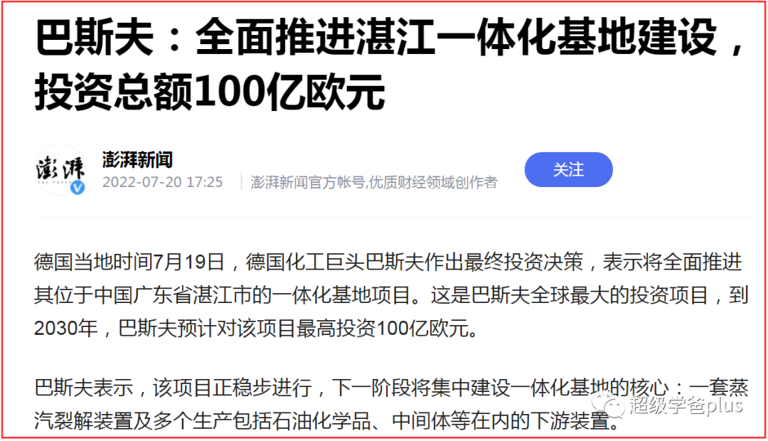 7月19日,巴斯夫歐洲公司做出了重大投資決策,全面推進其位於中國廣東省湛江市的一體化基地項目,投資額100億歐元,9月6日首套裝置已經投產。