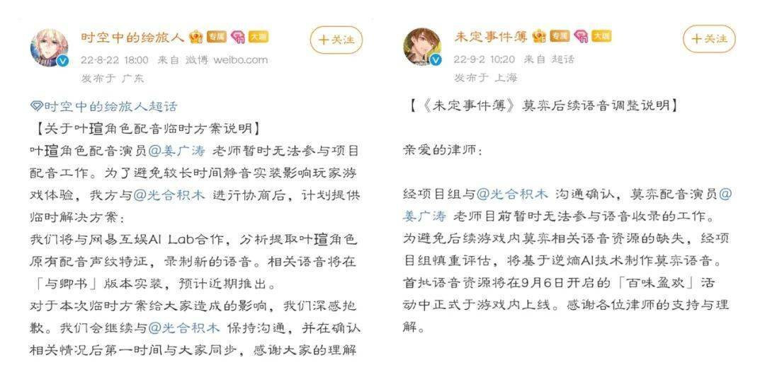 在原定錄音工作無法完成的情況下,為了保障重要遊戲資源的完整,臨時調整計劃或更換CV並不少見。近日,因為負責當期內容的配音演員無法參與錄製,《時空中的繪旅人》和《未定事件簿》也相繼發佈了角色更換配音的公告,不過,這次並不是換人,而是用AI配音替代真人錄製。