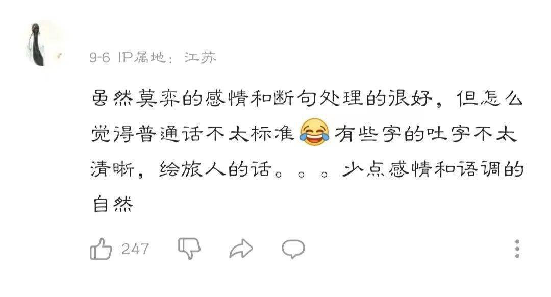 不過,鑑於這是兩個人第一次“學説話”,評價大體上還是包容居多,甚至自發尋求合理性,比如莫弈的略微氣虛契合了劇情設定下的曖昧氛圍,葉瑄的微妙停頓以及電流聲,恰好可以歸於“外星人”設定。