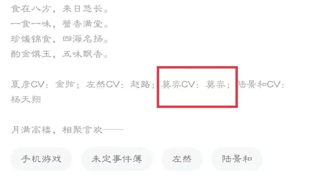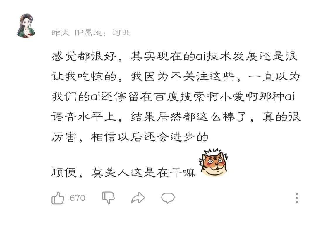 但無論是真人音源還是虛擬音源,由於AI的可調性,AI語音呈現出來的效果和真人也有着微妙的差異。這在虛擬歌手上比較常見,在聲線和語氣上已經高度還原的莫弈身上,也會產生一種角色和CV分離開來的感覺,給人的感覺像“貼莫而不貼姜”。而神奇的是,這種與真人稍微剝離的感覺,似乎並不會讓玩家不滿,反而讓他們更有代入感。