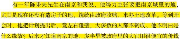 第二個例子,是陳果夫的“土地改革”。有一年陳果夫在南京對蔣夢麟談到,他極力主張要把南京的土地統統收歸政府所有,然後來搞土地改革。等到開會的時候,陳果夫把計劃提出來以後呢,是左右碰壁,推行不下去。