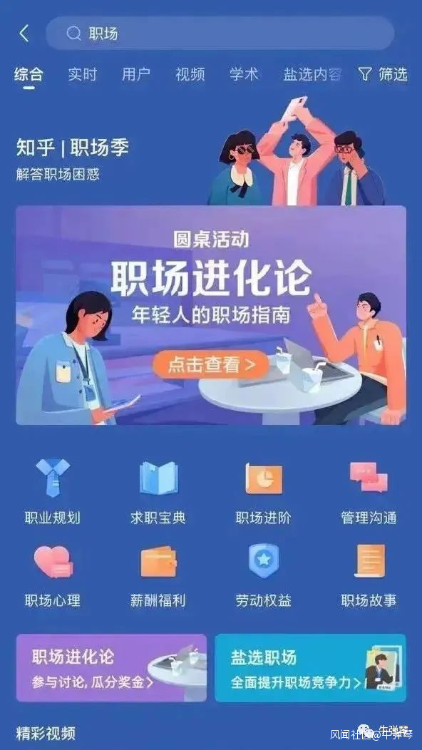此前眾多內容平台圍繞職場的內容生態大多集中於“信息”,知乎當然也重視這點。比如此次知乎“職場季”站內發起的“職場進化論”圓桌活動,聚焦25-30歲的職場人羣關注的職業規劃、求職寶典、職場進階、薪酬福利、勞動權益、職場心理相關專業討論。