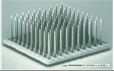 這是一種用硅製作的二維電極陣列,通過機械切割+化學腐蝕,每根電極長度能做到1mm左右,間距在幾百微米左右,記錄點位於電極的尖端,可以深入大腦皮層。