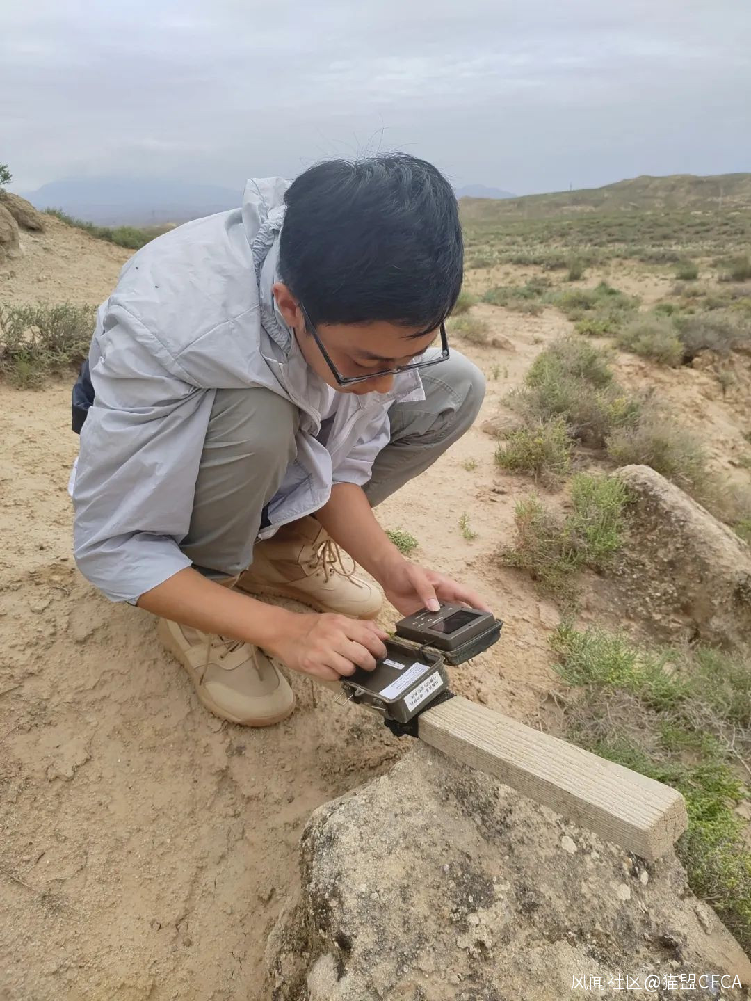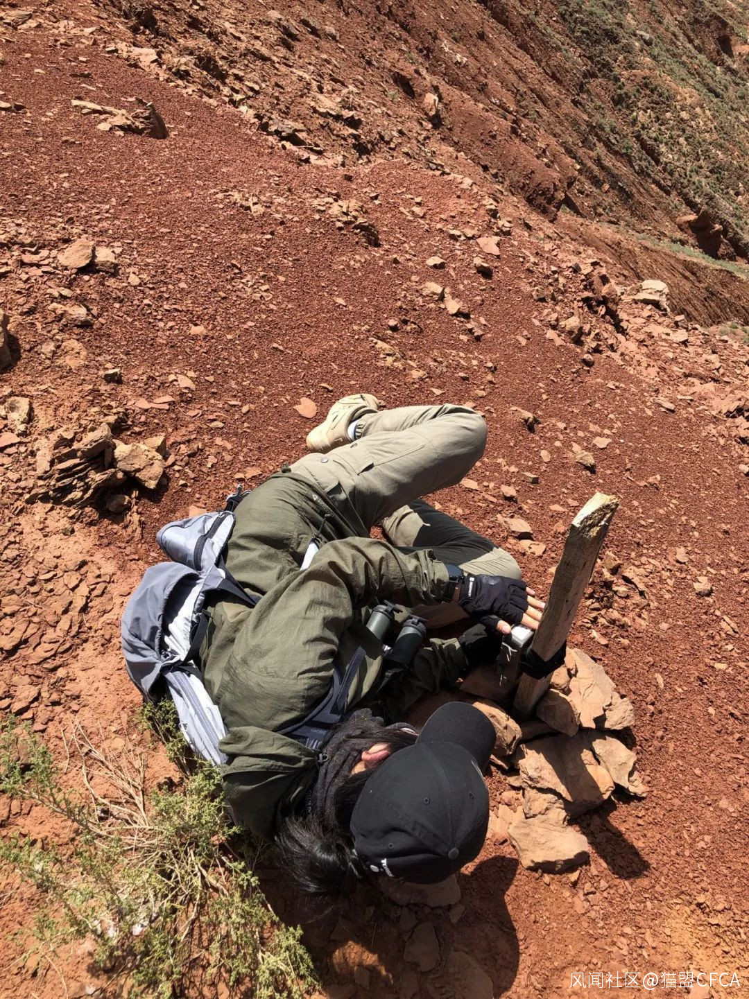 在荒漠裏拍兔猻有兩個難題,一是兔猻底盤低,要拍它正臉相機就得放得很低,相機放得低看數據的時候就很費勁,荒漠裏太陽又大,得湊得很近才能看清屏幕。