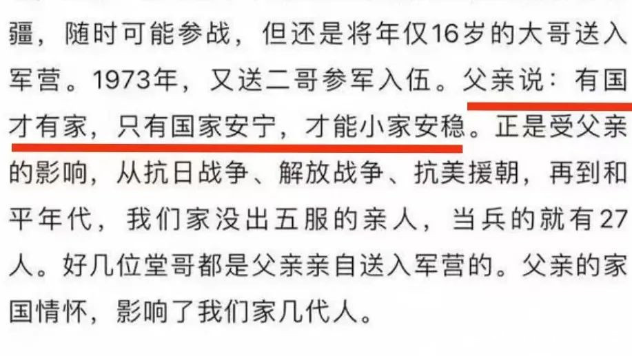 關於為什麼要參軍,近期火爆網絡的文章《我的縣長父親》中,父親於志明用樸素的話語道出了參軍的使命和意義。文章講述了這樣一件事:即便當年父親知道戰事一觸即發,新兵很有可能隨時參戰,但還是毅然將年僅16歲的大哥送入軍營。時隔幾年後,父親又送二哥參軍入伍。對於父親為什麼要作出這種選擇?文中只用了一句話來作答——“有國才有家,只有國家安寧,才能小家安穩”,雖然簡短樸素,但足以震撼人心。正是受父親家國情懷的影響,作者一家沒出五服的親人,當兵的就有27人。