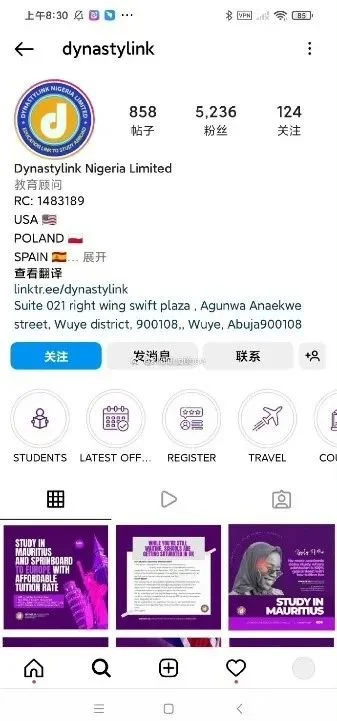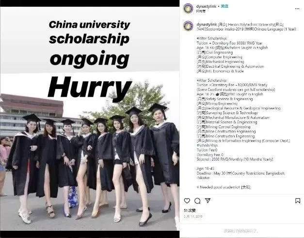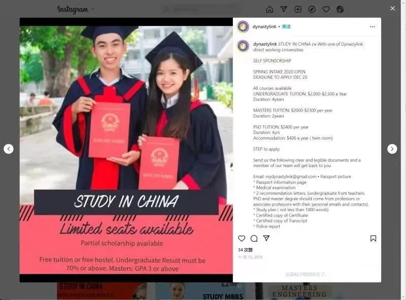 在谷歌和ins中對dynastylink進行檢索並排查,發現該賬號歸屬於尼日利亞的留學中介機構Dynastylink Nigeria Limited。在該賬號2019年5月17日的發佈中可以找到相關內容,文字顯示為“河南理工大學#獲得獎學金後:學費+宿舍費:9000元/年”等宣傳話語。
