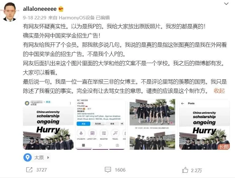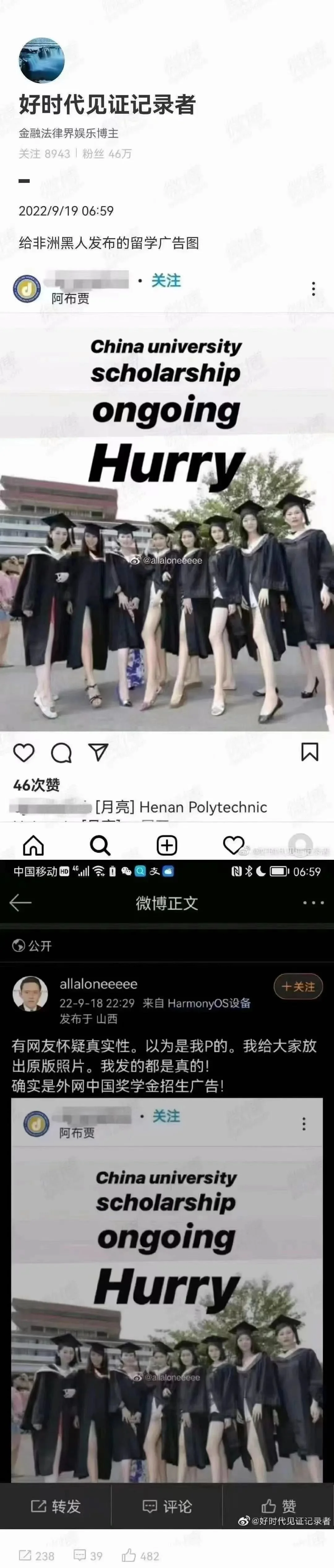 第一張圖內容為8位身着學位服的女生合照,上方的文字顯示“中國高校獎學金招生中,快來”。第二張則解釋了上圖轉自一位名為“allaloneeeee”的用户,“allaloneeeee”的配文中説:“有網友懷疑真實性。以為是我p的。我給大家放出原版圖片。我發的都是真的!確實是外網中國獎學金招生廣告。”