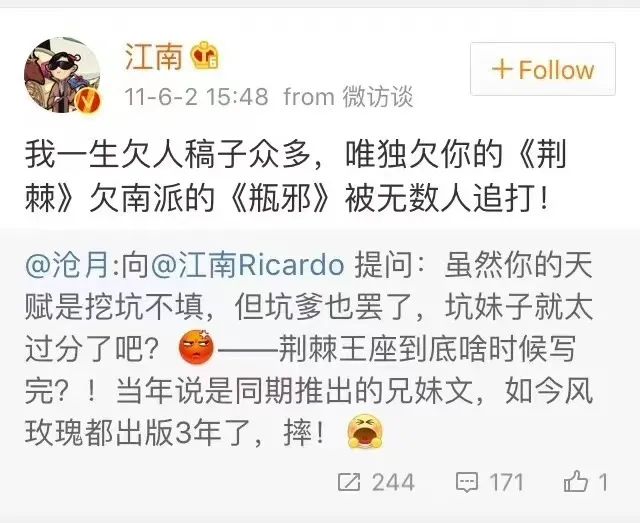 成名網文作家的更文節奏可以達到一天萬字,而江南曾經多次在微博評價自己“寫得很慢”:“出版速度也就是一年一本到一本多點,過去的幾年裏我們多番嘗試也沒能突破這個速度限制,現在依舊突破不了,所以沒法催。”