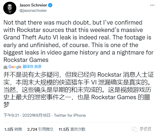 而根據Jason Schreier的説法,他之所以説這是R星的噩夢,一是R星得花額外時間去處理這件事,二是此事之後R星的管理層可能沒法像以前那麼靈活的在家辦公了。