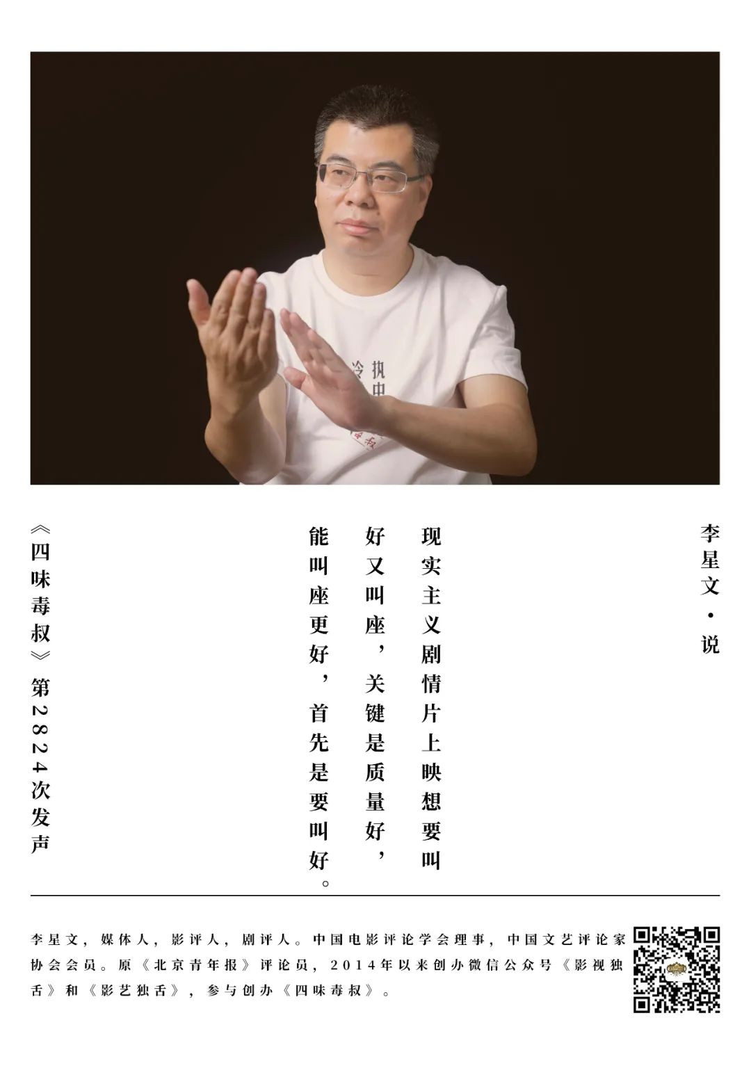 **李星文:**反正我想提醒大家注意這個導演是一個很有力量的、對現實有表達的導演。現在來講講第三類不太叫好也不太叫座的現實主義劇情片,這種就比較多了。我覺得現在一些主題先行的影片可能就比較麻煩,比如關於疫情的一些拼盤式的電影,現在市場肯定是不太叫好叫座。在疫情的基礎上再去加一些其他話題和概念也挺生硬。總之,我覺得如果一旦主題先行的,再想把它做得特別鮮活就有點難。
