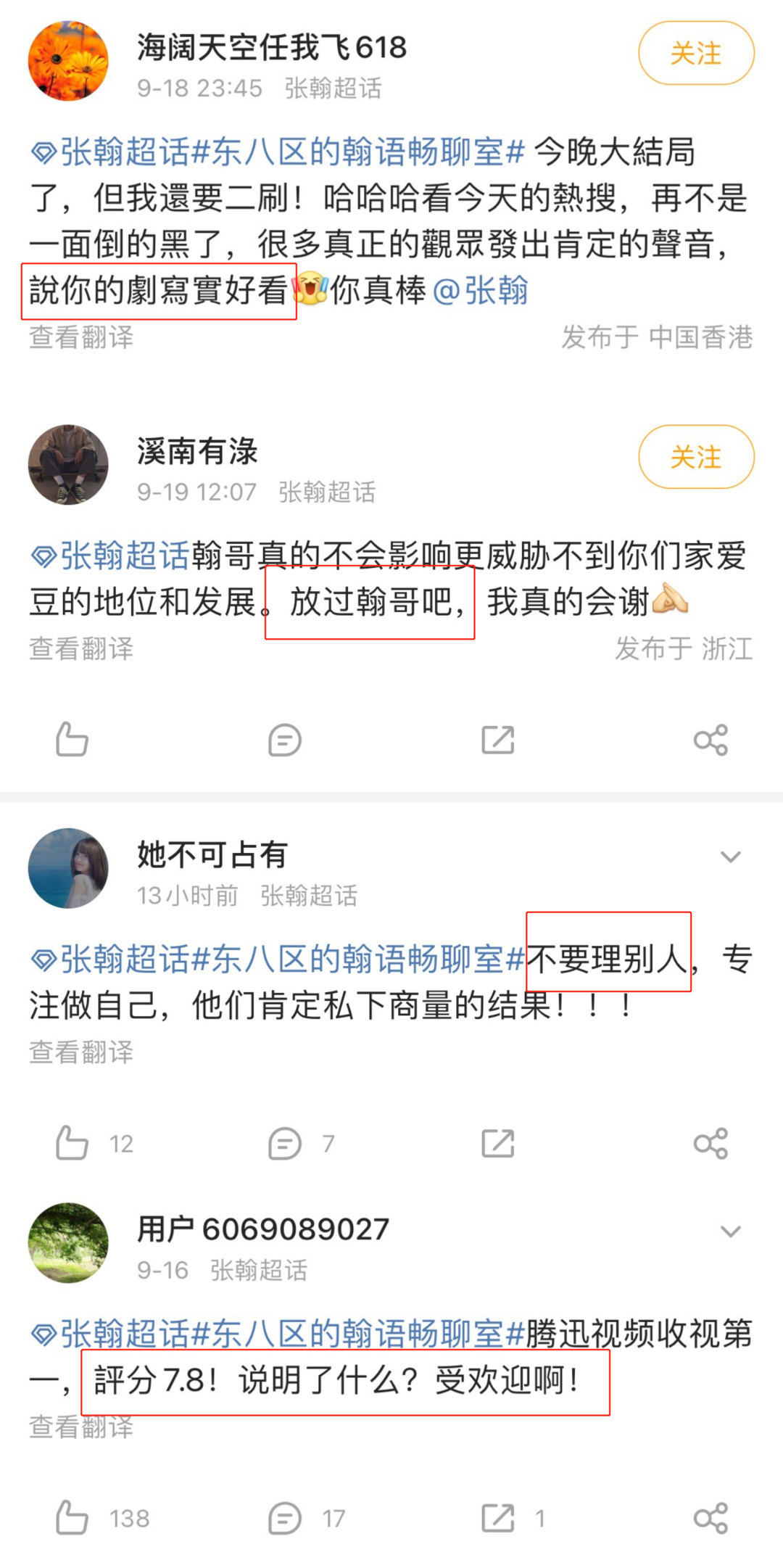 有粉絲説罵張翰的都是為黑而黑,都是斷章取義;有粉絲説張翰寫的劇很好看;有粉絲讓他不要聽外界的聲音,有粉絲求輿論放過張翰;有粉絲説這部劇收視高説明很受歡迎……