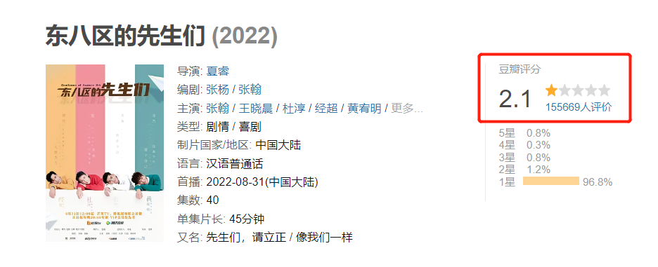 全網刷屏的“東八區”也不負眾望地打破一些歷史記錄,比如創造了2021年以來國產劇的最低分,2.1分。