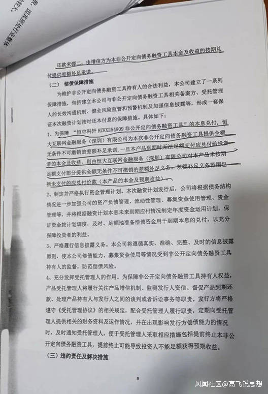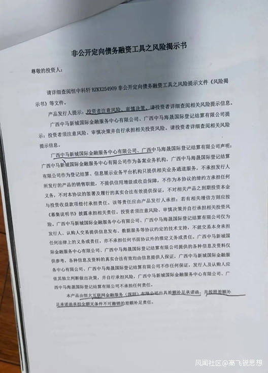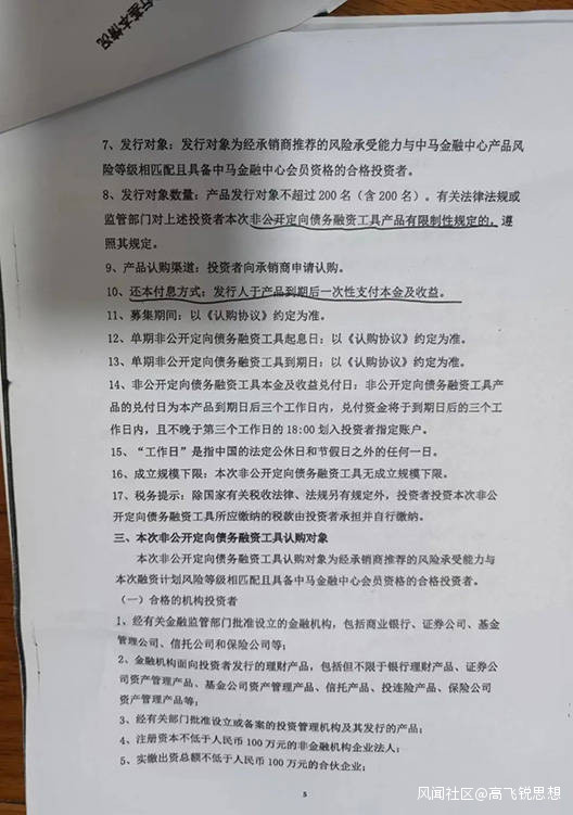 雖然投資前,有投資理財風險提示,但讓張女士敢於這樣下大血本的是風險提示上的還本付息方式承諾,其上白紙黑字地寫着:發行人於產品到期後一次性支付本金及收益,兑付期為產品到期日後三個工作日內,且不晚於第三個工作日的18:00。若發行人未按期足額向投資者兑付,每逾期一日,應按逾期金額的萬分之三向投資者支付違約金。還款來源之一:發行人經營活動及與其相關的投資業務中所產生的收入直接用於歸還非公開定向債務融資工具各期應兑付本金及收益。還款來源之二:由增信方為非公開定向債務融資工具本金及收益的按期兑付提供差額補足承諾。