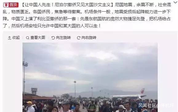 2015年尼泊爾8.1級大地震,造成超過3000人死亡,大量外國遊客滯留。中國民航飛機第一批抵達尼泊爾,接回中國遊客,第一時間抵達尼泊爾機場的只有東航、國航、南航等中國民航的飛機,只有持中國護照的遊客第一時間撤離了災區。