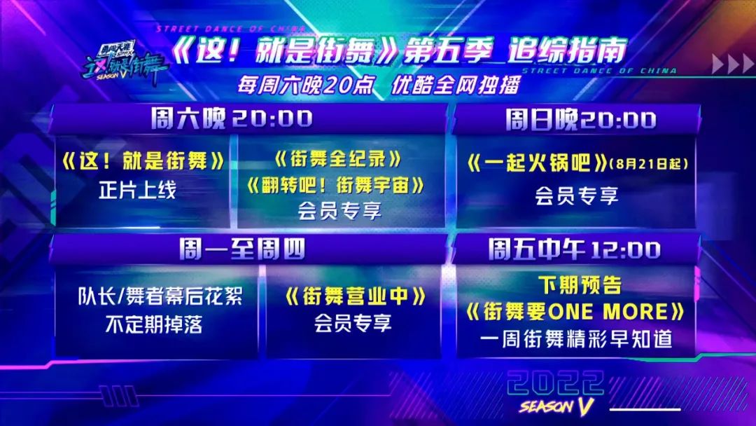 圍繞《街舞》IP,優酷打造了豐富的節目帶,在主節目之外,今年優酷推出的 “街舞宇宙”致力於給觀眾帶來全場景IP體驗。一週七天觀眾可觀看《街舞全記錄》《翻轉吧!街舞宇宙》《一起火鍋吧》《街舞營業中》《街舞要ONE MORE》等衍生節目,沉浸式享受街舞的快樂。