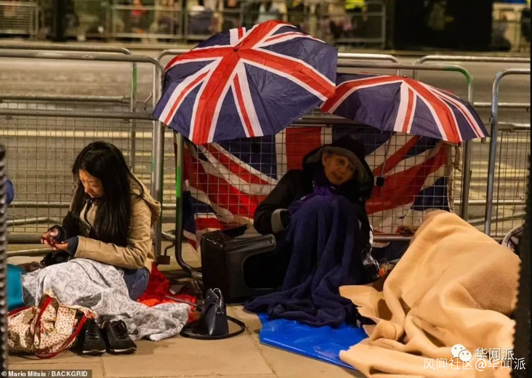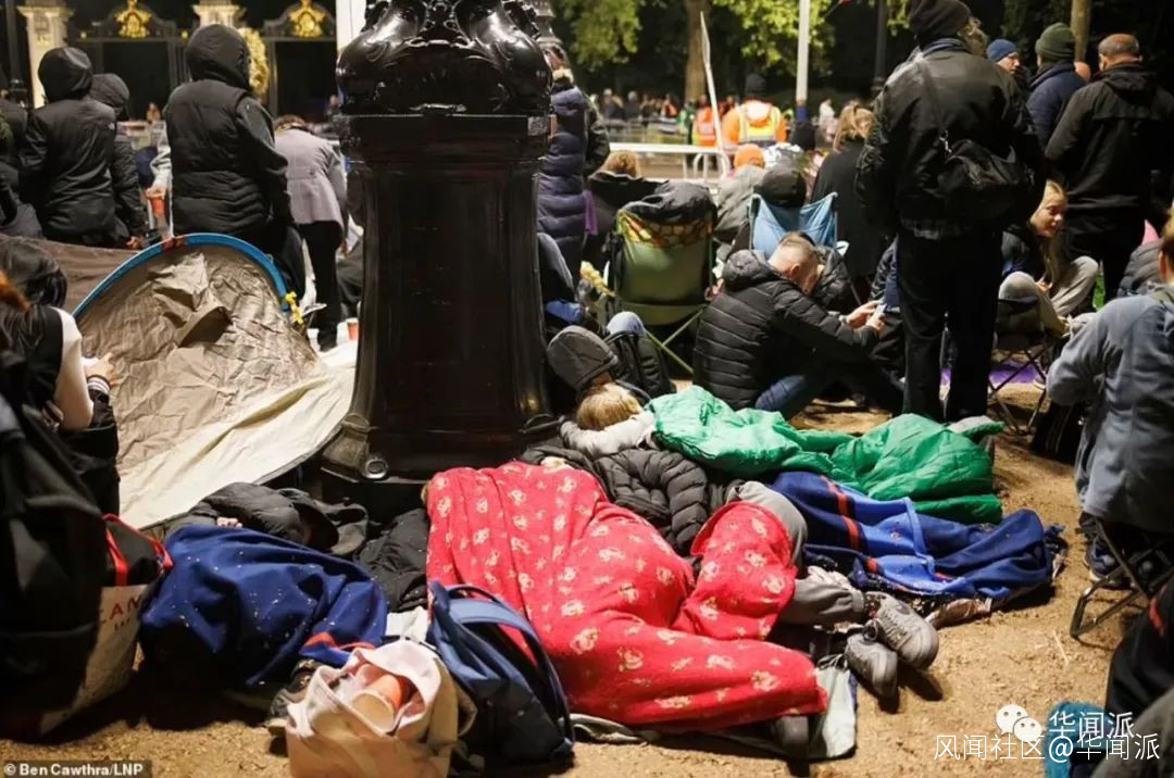 從昨天夜裏開始,已有不少民眾在靈柩經過的路線兩旁安營紮寨,徹夜等候,只為在今天送女王最後一程。