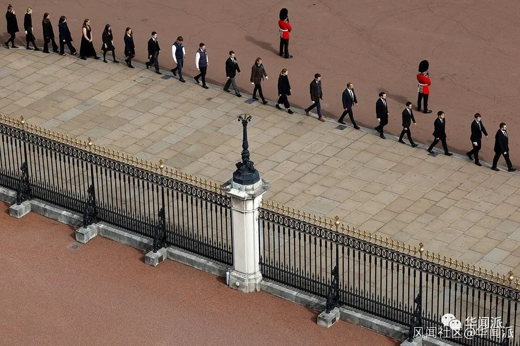 而當靈柩被運送到白金漢宮周圍時,白金漢宮的工作人員站成一排,列隊向女王靈車致意。