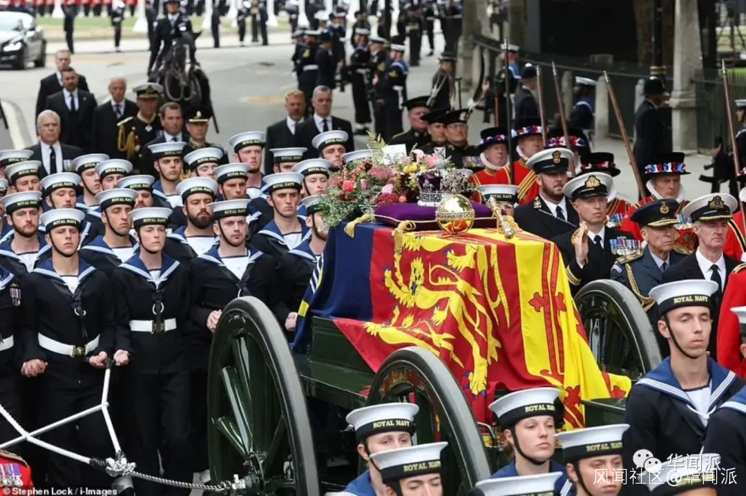 昨天早上10:45,在142名皇家海軍水兵的護送下,一輛擁有123年曆史的炮車將女王靈柩運載到了威斯敏斯特教堂。